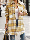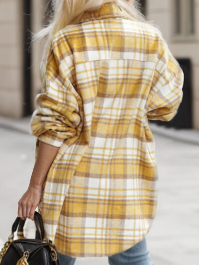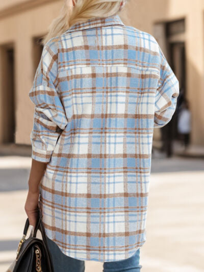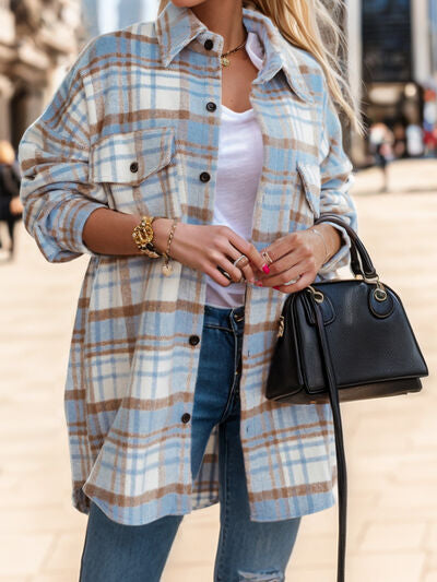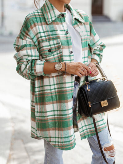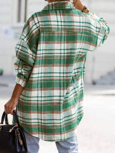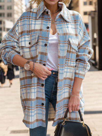 Pocketed Plaid Button Up Dropped Shoulder Shacket